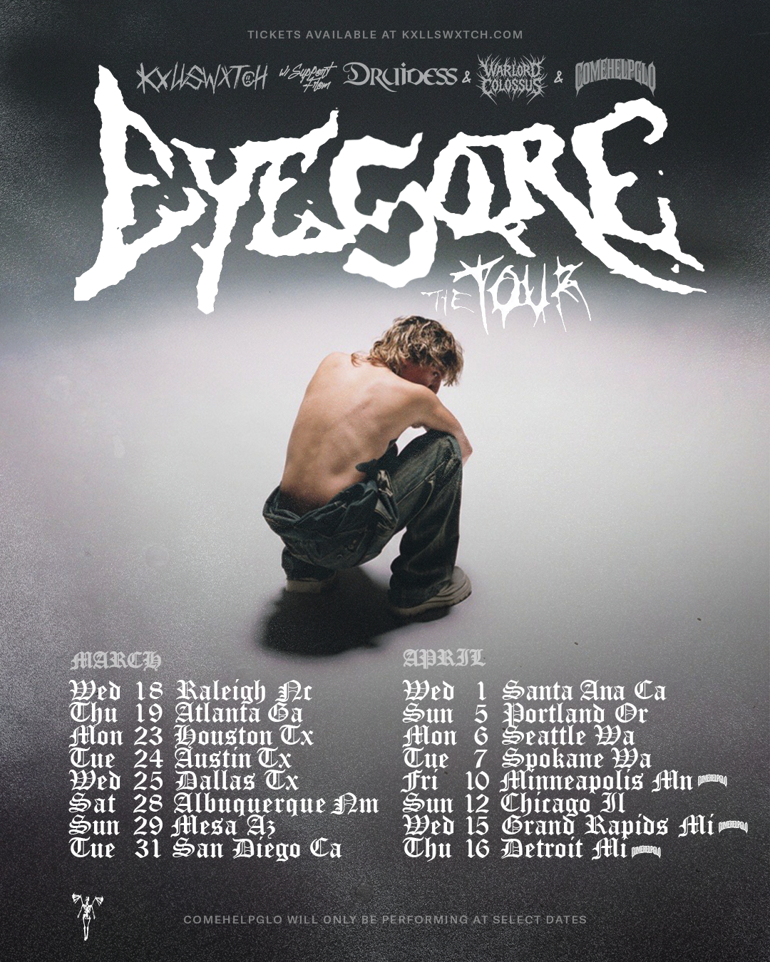 ALL BUT SIX PRESENTS EYESORE TOURKXLLSWXTCH DATE: MARCH 18TH - APRIL 16TH TICKETS ARTISTS POUYA FAT NICK MIKEY THE MAGICIAN KXLLSWXTCH LU SOUTH STRIP GUTTERBOYSOUZ TERROR REID DRUIDESS NEW MUSIC FAT NICK I WON’T LIVE FOREVER KXLLSWXTCH EYESORE DRUIDESS ALL YOU ARE TERROR REID SAMSARA GUTTERBOYSOUZ FILLET O FISH POUYA KYSOSTFU
